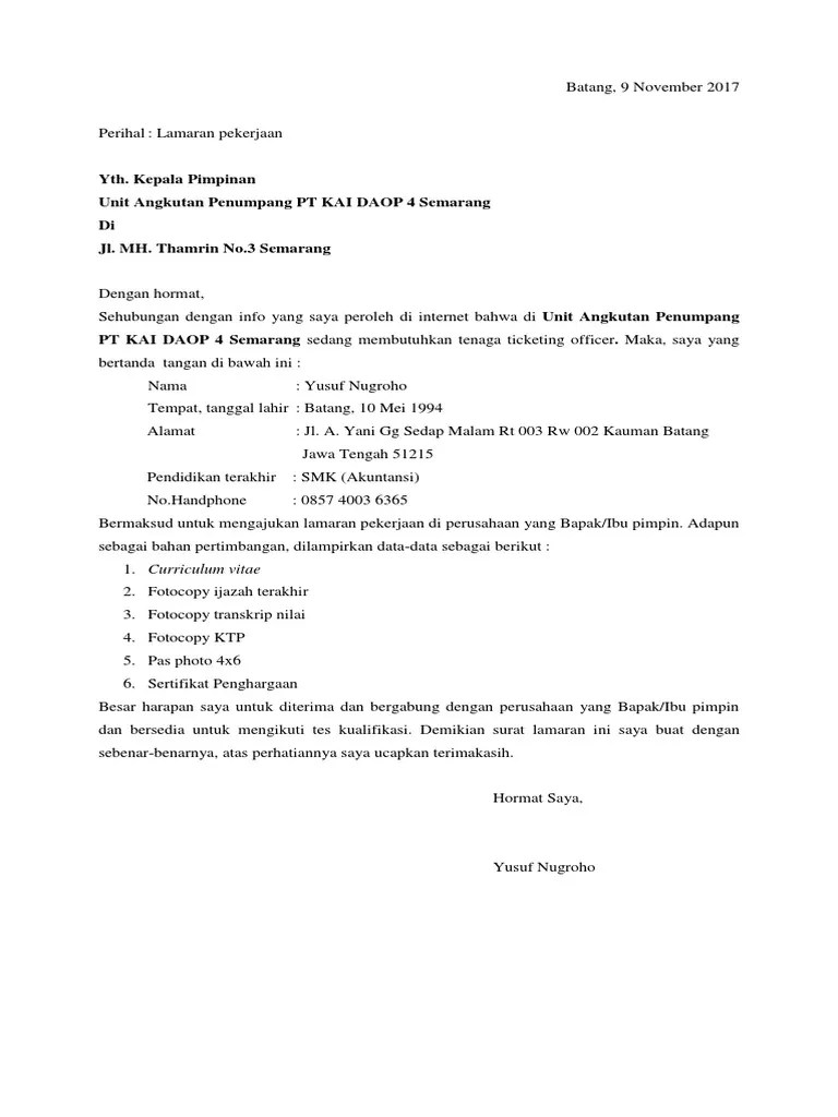 Contoh surat lamaran kerja pt kai 2019 dapatkan.